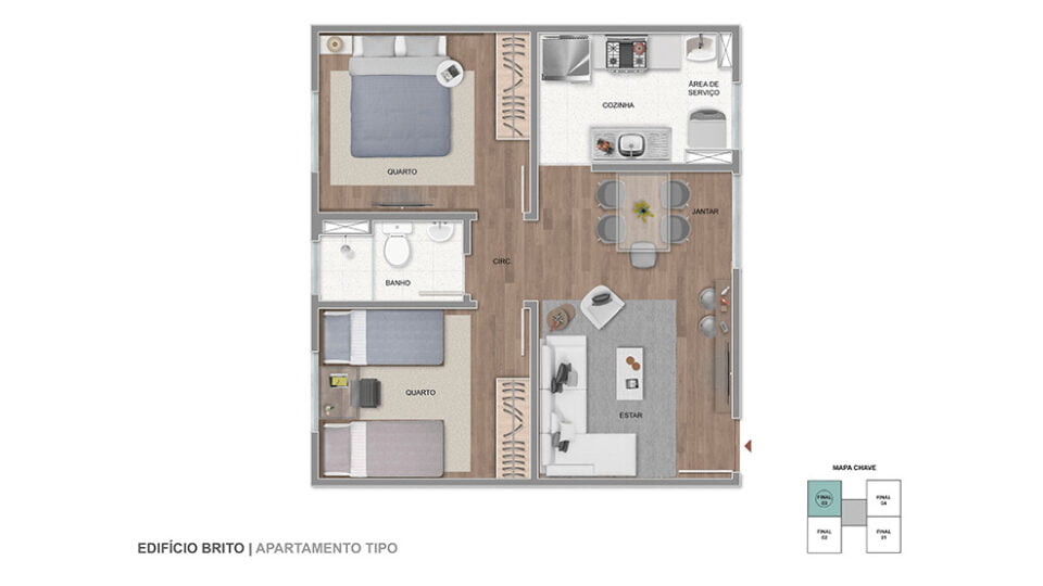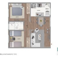 • Blocos 1 a 3 e 5 a 25: Unidades Tipo de 44 m²